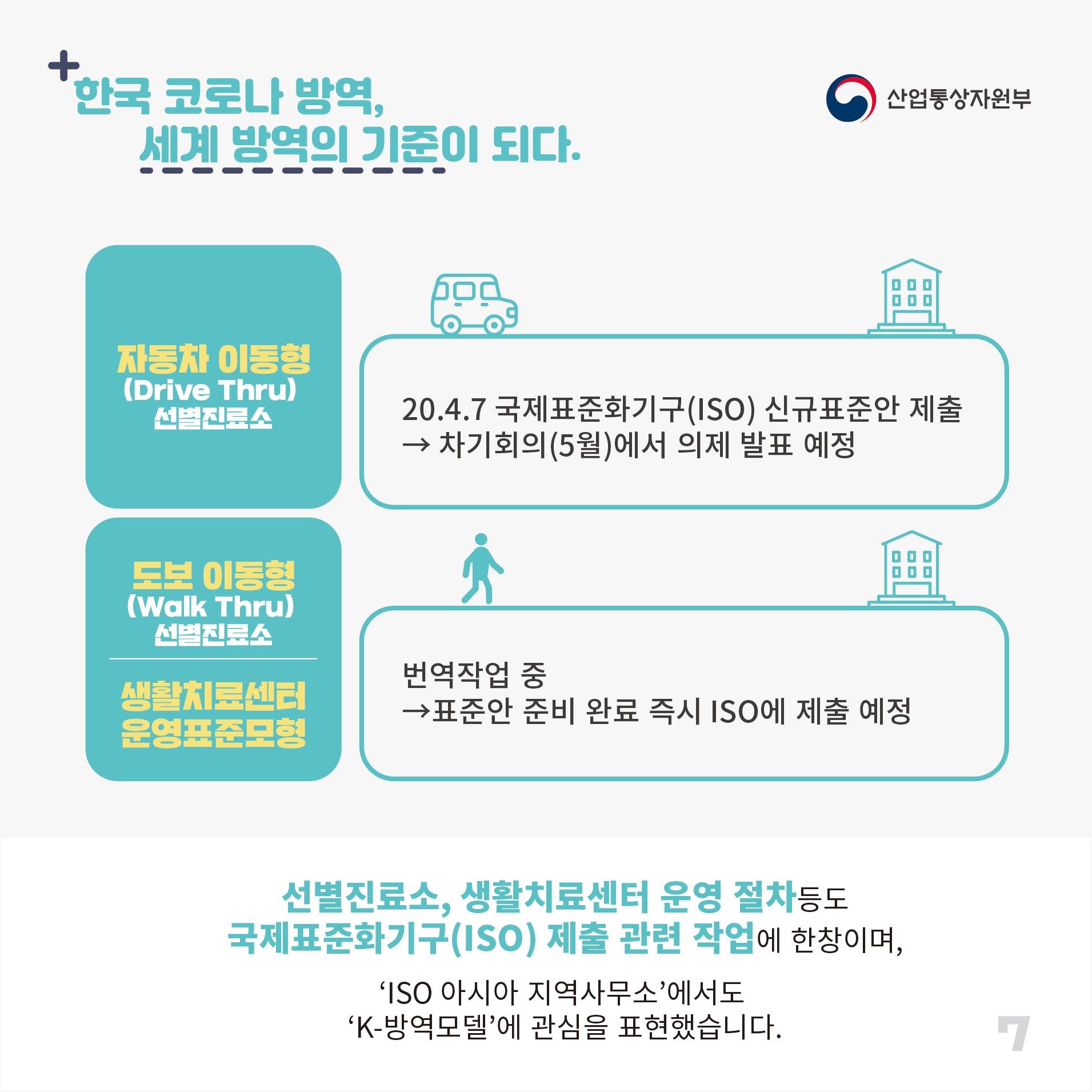 선별진료소, 생활치료센터 운영 절차 등도 국제표준화기구(ISO) 제출 관련 작업에 한창이며, ‘ISO 아시아 지역사무소’에서도 ‘K-방역모델’에 관심을 표현했습니다.