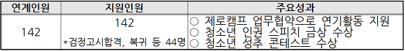 특히, 문화예술단체인 (사)제로캠프(이사장 최불암)과 업무협약을 맺어 학교 밖 청소년들을 위한 다양한 문화예술교실을 마련했고, 지난해 청소년 인권스피치대회, 청소년 성우콘테스트에서 수상한 바 있다.