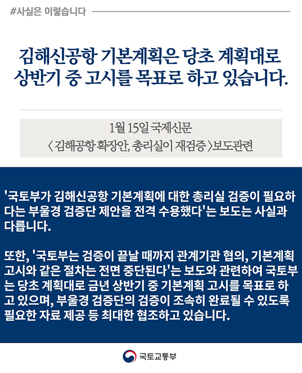 ‘국토부가 김해신공항 기본계획에 대한 총리실 검증이 필요하다는 부울경 검증단 제안을 전격 수용했다’는 보도는 사실과 다릅니다.