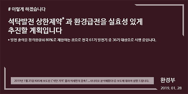 1월 22일 산업부 발표와 같이, 정부는 고농도 기간 미세먼지 감축을 위해 봄철 상한제약 발령일수 확대 및 저유황탄 사용확대, 노후석탄 가동중단 등의 다양한 조치를 추진할 예정