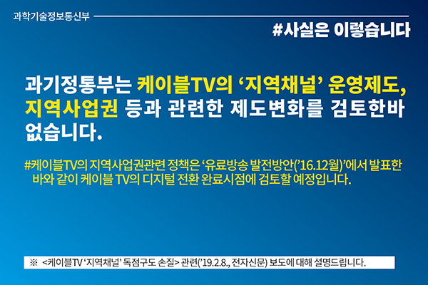 과학기술정보통신부는 “종합유선방송사업자 등의 지역사업권 및 지역채널 관련 구체적인 정책방향을 검토한 바 없다”고 밝혔습니다.