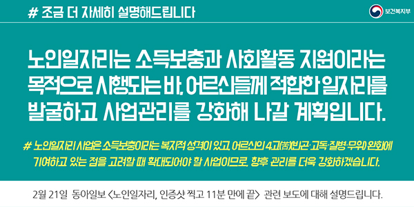 보건복지부는 “노인일자리 사업은 소득보충과 노인의 4고(빈곤·고독·질병·무위) 완화에 기여하고 있는 점을 고려, 확대돼야 할 사업이므로 향후 적합한 일자리 발굴과 사업관리를 더욱 강화할 계획”이라고 밝혔습니다.