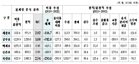 세종보, 공주보, 죽산보의 경우 보를 유지할 경우에 1,688억 원*이 소요될 것으로 추산되므로, 해체하는 것이 오히려 세금 낭비를 줄일 수 있는 것으로 평가되었음