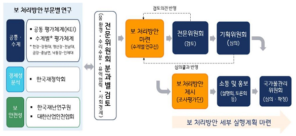 국가물관리위원회에서 처리방안이 확정되고 나면 그 결과에 따라 예비타당성조사, 관련 법정계획의 변경 등 행정절차, 기본·실시설계 등 처리방안별 필요한 절차를 거쳐 시행될 예정임
