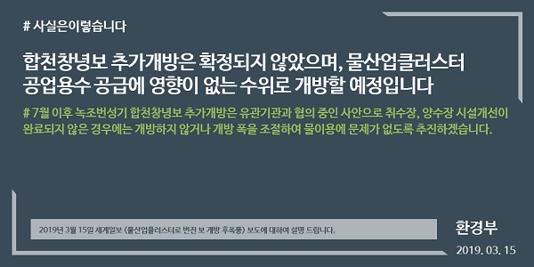 환경부는 “녹조번성기 합천창녕보 추가개방은 유관기관과 논의 중인 사안으로 확정되지 않았다”며 “추가 개방할 경우에도 취수장 개선 등을 통해 물산업클러스터 용수공급에 영향이 없는 수위로 개방할 예정”이라고 밝혔습니다.