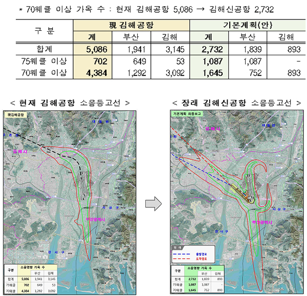 부울경 검증단이 제시한 소음영향(2만3,192가구)은 소음진동관리법에 따라 2023년부터 도입되는 항공기 소음평가단위 Lden으로 계산한 결과로 보이나, 장래 운항횟수 등 입력 변수 확인이 필요합니다.