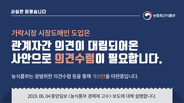 농림축산식품부는 “지난 2000년 도매시장 유통주체간 경쟁 촉진과 출하자 선택권 확대 등을 위해 시장도매인제를 제도화해 강서시장에 도입했으며 가락시장 도입은 이해관계자간 의견이 첨예하게 대립하고 있어 광범위한 의견수렴 등을 통해 개선안을 마련 중에 있다”고 밝혔습니다. 또 “향후 거래제도를 포함한 도매시장 제도개선 전반에 대해 의견수렴을 거쳐 개선방안을 만들어 나갈 계획”이라고 덧붙였습니다.