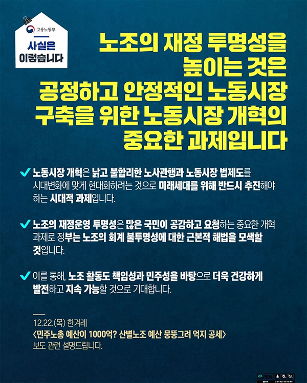고용노동부는 “노조의 재정 투명성을 높이는 것은 공정하고 안정적인 노동시장 구축을 위한 노동시장 개혁의 중요한 과제”라고 밝혔습니다.