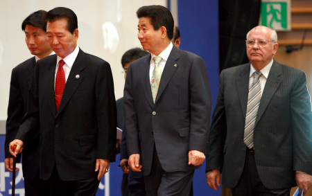 노무현 대통령과 김대중 전 대통령, 고르바초프 전 소련 대통령이 16일 오전 광주 김대중 컨벤션센터에서 열린 2006 노벨평화상수상자 광주정상회의 개회식에 참석하기 위해 입장하고 있다.<사진:연합뉴스>