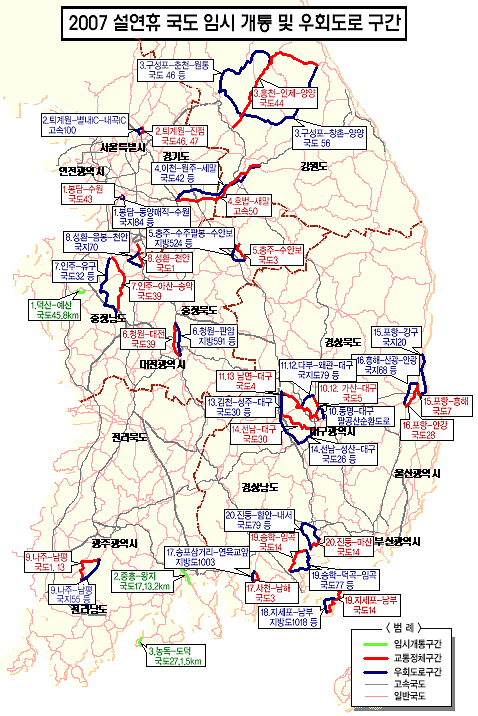 또 퇴계원에서 춘천 방향 국도 46호선 구리~남양주 구간(6km)의 경우 국도 43호선 퇴계원IC~내곡IC(8.5km)를 우회도로로 안내하는 등 전국 20개 구간에 우회도로 안내표지판을 세워 교통량을 분산시킨다.