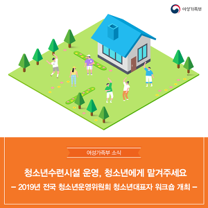 여성가족부(장관 진선미)는 청소년이 주인공이 되어 청소년수련시설을 직접 만들어가기 위해 8월 29일(목)부터 31일(토)까지(2박 3일) 국제청소년센터(서울 강서구 소재)에서 ‘2019년 전국 청소년운영위원회* 청소년대표자 워크숍(연수회)’을 개최한다.