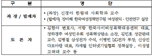 신경아 한림대 사회학과 교수가 좌장을 맡았으며, 한국여성정책연구원 장미혜 여성권익․안전연구실장이 기조 발제를 한다.