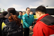 한덕수 대통령 권한대행 국무총리가 28일 경북 안동체육관에 마련된 산불 주민대피소를 방문, 주민들을 위로하고 있다.