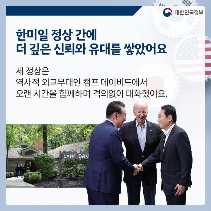 세 정상은 역사적 외교무대인 캠프 데이비드에서 오랜 시간을 함께하며 격의없이 대화했어요.