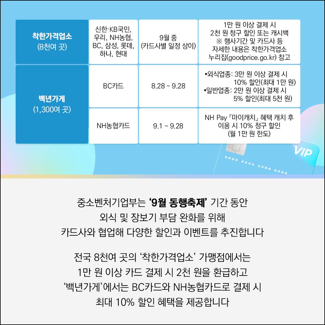 중소벤처기업부는 ‘9월 동행축제’ 기간 동안 외식 및 장보기 부담 완화를 위해 카드사와 협업 해 다양한 할인과 이벤트를 추진합니다.