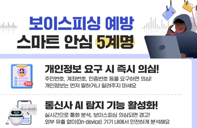 보이스피싱 예방 스마트 안심 5계명■ 개인정보 요구 시 즉시 의심!주민번호, 계좌번호, 인증번호 등을 요구하면 의심! 개인정보는 먼저 말하거나 알려주지 마세요.■ 통신사 AI 탐지 기능 활성화!실시간으로 통화 분석, 보이스피싱 의심되면 경고! 외부 유출 없이(On-device) 기기 내에서 안전하게 분석해요.■ 낯선 전화는 끊고 공식번호로 확인!수사기관·금융기관에서 돈이나 개인정보를 요구하면 일단 끊고, 공식번호로 확인하세요.■ 출처 불명 링크와 앱 설치 주의!문자·메신저로 전달된 출처 불명 링크, 어플 설치 등 주의! 공식 앱마켓·홈페이지로 다시 확인하세요.■ 가족·지인에게 송금 전 반드시 재확인!메신저·전화로 급하게 돈을 요구하면 반드시 본인에게 직접 확인하세요. - 신고전화: 경찰청 ☎112, 전기통신금융사기 통합대응단 ☎1394, KISA(개인정보침해) ☎118 개인정보위는 국내 통신 3사와 보이스피싱 예방에 앞장서고 있습니다!통신 3사(KT, LGU+, SKT) '실시간 통화 기반 보이스피싱 탐지 서비스'에 대한 규제샌드박스(실증특례) 허용