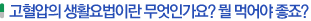 2) 식사요법 첫째, 식이요법에서 가장 중요한 것은 염분(짠음식) 섭취를 줄이는 것입니다. 염분은 혈압을 올리는 중요 인자이므로 짜게 먹는 습관을 가진 분은 반드시 싱겁게 먹도록 해야 합니다. 보통 한국사람의 1일 소금섭취량은 15~20 g 입니다. 이를 절반 이하로 줄이는 것이 매우 중요합니다. 하루 약 10.5 g의 소금을 섭취하는 사람이 섭취량을 반으로 줄이면 수축기 혈압이 평균 4~6mmHg감소하는 것으로 보고되고 있습니다. 염분 섭취에 따른 혈압의 반응은 사람마다 다릅니다. 그러나 노인이나 고혈압 환자, 당뇨병 환자들은 일반사람보다 염분에 민감합니다. 즉 똑같이 짜게 먹어도 일반인 보다 혈압이 훨씬 더 올라 갑니다. 싱겁게 먹으면 고혈압약의 용량도 줄일 수 있습니다. 게다가, 골다공증과 신장결석도 예방이 됩니다. 요리를 할 때 소금을 덜 넣으시고, 다 된 요리에 추가로 소금을 넣지 마십시오.