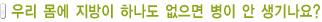 거울을 바라보면서 내 몸에 있는 지방덩어리를 혐오스럽게 바라본 기억을 누구나 한번쯤은 가져본 기억들이 있을 것입니다. ‘내 몸에 지방 덩어리가 하나도 없었으면 좋겠다’ 이렇게 생각하는 사람들은 이 또한 여러 문제가 있다는 것을 알아야 합니다.