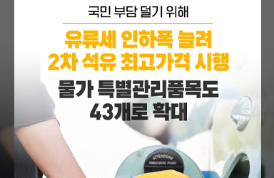 국민부담 덜기 위해 유류세 인하폭 늘려 2차 석유 최고가격 시행물가 특별관리품목도 43개로 확대 - 민생물가 특별관리 관계장관 TF 5차 회의(2026.3.26.)☞ 정책뉴스로 자세히 보기