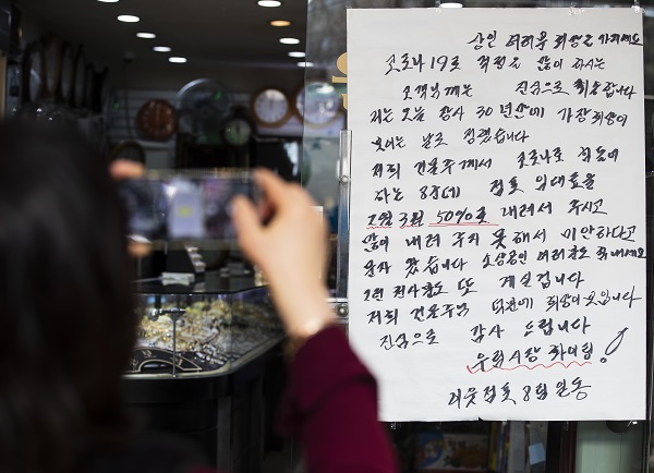 27일 오후 서울 망우본동 우림시장의 한 건물에 2, 3월 임대료 50% 경감에 희망이 보인다는 내용의 세입자들이 남긴 감사글이 붙어 있다. 우림시장에 위치한 2층 건물 8개 매장대표인 건물주 김 모씨는 지난 26일 세입자들에게 신종 코로나바이러스(코로나19) 감염증으로 인한 매출 감소를 염려하며 2,3월 임대료 50% 경감 소식을 전했다. (사진=저작권자(c) 연합뉴스, 무단 전재-재배포 금지)