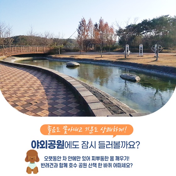 오랫동안 차 안에만 있어 찌뿌둥한 몸 깨우기! 반려견과 함께 호수 공원 산책 한 바퀴 어떠세요?