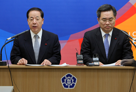 | 김경한 법무부장관과 정남준 행정안전부 제2차관이 16일 오전 서울 도렴동 정부중앙청사별관에서 ‘서민생활안정을 위한 민생치안대책’ 을 발표하고 있다.<사진=연합뉴스> |