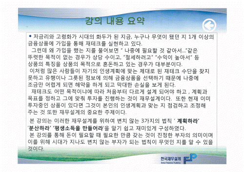 설명, 그리고 행복한 부자로 가는 재무설계로의 초대라는 주제로 특강이 있었다.