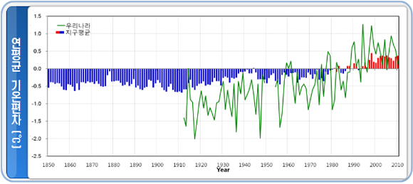 지난 100년간 전지구 평균기온이 0.75도가 상승하는 가운데 우리나라에서는 강릉, 서울, 인천, 대구, 부산, 목포를 포함한 6대 도시의 경우 1.8도가 올라가서 전지구보다 2배 이상 높아진 것으로 조사됐으며, 지난 40년간 1.4도가 상승하여 최근 급격히 기온이 오르는 것으로 나타났다.