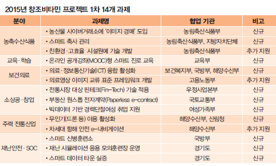 이에 미래창조과학부는 과학·ICT의 창의적 활용을 통해 공공 분야의 핵심 사회 현안을 해결하고 산업 활력을 제고하기 위해 지난해까지 57개 사업을 발굴해 추진해왔다. 특히 올해엔 우선 1차로 14개 과제(신규 사업 11개, 계속 사업 3개)를 추가로 선정해 177억 원의 예산을 투입할 것이라고 3월 2일 밝혔다.