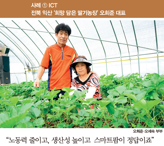 오 대표는 1800평 6개 동 비닐하우스에 2012년 정부의 시설원예 품질 개선사업을 통해 스마트팜 시스템을 설치하고 고설 수경재배로 전환했다. 하우스 외부에서도 휴대전화를 통해 온도, 습도, 측창, 수막, 환기시설 등 5가지 기능을 제어할 수 있게 된 것. 비닐하우스 내부 환경이 세팅해놓은 오차 범위 밖으로 벗어나면 스마트폰 알람을 통해 경보음이 울린다. 시스템 설치비용은 350만 원이며, 월 사용료는 1만1000원. 이를 지켜본 익산 탑마루 딸기 회원 농가 6곳도 같은 시스템을 도입했다. 최적의 환경을 조성하는 데 도움을 주면서 작물의 품질과 생산력이 향상됐다.