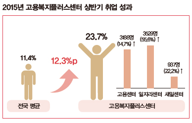 이처럼 고용복지플러스센터 확산에 가속도가 붙는 것은 지역주민들의 만족도가 높은 데다 취업 실적도 뚜렷하기 때문이다. 실제로 지난해 5월 4점(5점 기준)이던 고용복지플러스센터에 대한 만족도는 올 7월 4.22점으로 올랐고, 취업률은 전국 일반교육센터 평균 11.4%에 비해 고용복지플러스센터는 23.7%를 기록해 월등한 차이를 보였다. 또한 기관 간 서비스 연계 건수가 2014년 9~12월 959건에서 올해 1~8월 4871건을 기록하며 입주기관 간 서비스 연계가 활성화됐다는 평가를 받고 있다.