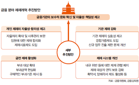 정부는 금융 분야의 현장 목소리에 집중해 제도를 개선하는 한편 금융기관이 자율성을 발휘할 수 있는 기반을 마련한다. 금융위원회와 금융감독원이 9월 1일 제재의 중심축을 개인에서 기관·금전 제재로 전환하기 위해 ‘금융 분야 제재개혁 추진방안’을 발표한 것도 그런 맥락이다.