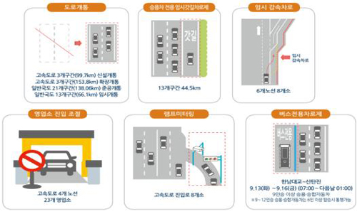 고속도로 및 국도 준공개통 또는 임시개통, 갓길 차로 확대, 임시 감속차로 운영 등을 통해 소통이 원활히 되도록 할 계획이다.