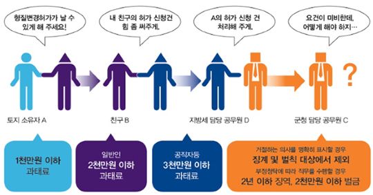● 반면, 담당 공무원 C가 지방세 담당 공무원 D의 부정청탁에 따라 토지형질변경허가를 내 줄 경우 형사처벌 대상(2년 이하의 징역 또는 2천만원 이하의 벌금)