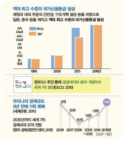 이 밖에 지난 7월 우리나라는 국제 채권국 모임인 ‘파리클럽’에 신흥국 최초로 가입했으며, OECD가 같은 달 발표한 ‘2015년 정부 백서(Government at a Glance 2015)’에서는 공공데이터 개방지수 1위로 평가받기도 했다.