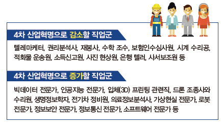 4차 산업혁명은 제조업 분야에서의 일자리 감소에도 큰 영향을 미칠 것으로 보인다. 재료, 화학, 섬유와 의복, 건설 관련직, 환경·인쇄·목재·가구·공예 및 생산단순직, 식품가공, 정보통신 종사자들도 4차 산업혁명으로 일자리가 감소할 것이라고 예측한 것으로 나타났기 때문이다. 그러나 사회복지사, 보육교사, 성직자, 육아도우미 등 사람들을 대상으로 돌봄 서비스를 제공하거나 타인의 정신세계에 영향을 미치는 업무를 수행하는 사회복지 및 종교 관련직은 4차 산업혁명으로 일자리 감소가 가장 적을 것으로 전망됐다.