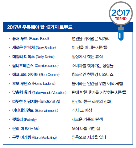 코트라가 꼽은 ‘2017년에 주목해야 할 12가지 트렌드’는 1~3년 안에 우리나라에서도 강력한 흐름을 만들어낼 것으로 예상되나 아직까지 국내에 소개되지 않은 내용들이다. 퓨처 푸드, 새로운 안식처, 데일리 디톡스, 옴니프레즌스, 에코 크리에이터, 호모 루덴스, 따뜻한 인공지능, 맞춤형 휴가, 이터테인먼트, 펫밀리, 온리 미, 구루 마케팅 등이 그에 해당한다.