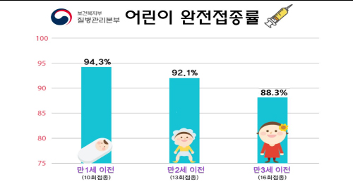 연령시기별 예방접종률은 첫돌 이전(만 0세, 4종백신 10회)은 94.3%, 만2세 이전(6종 13회)은 92.1%, 만3세 이전(7종 16회)은 88.3%로 각각 나타났다.