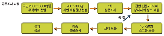 A. 사회적 합의를 도출하는 데에는 국회 결정, 전문가 협의, 국민투표, 공론조사 등 다양한 방법이 있다. 신고리 5·6호기 공사 중 단은 이해관계에 따른 갈등이 첨예한 사안인 만큼 전문가들의 찬반 토론으로 합의를 도출 하기가 매우 어렵다. 따라서 국민에게 의견을 묻고 국민이 받아들일 수 있는 결과를 도출하기 위해 공론조사를 활용하는 것이다. 객관적이고 공정하게 선정된 시민 배심원단은 전문가의 찬반 토론 등을 통해 정확한 정보를 제공 받고 숙의 과정을 거쳐 결론을 도출하게 된다. 물론 이 과정은 투명하게 공개된다.