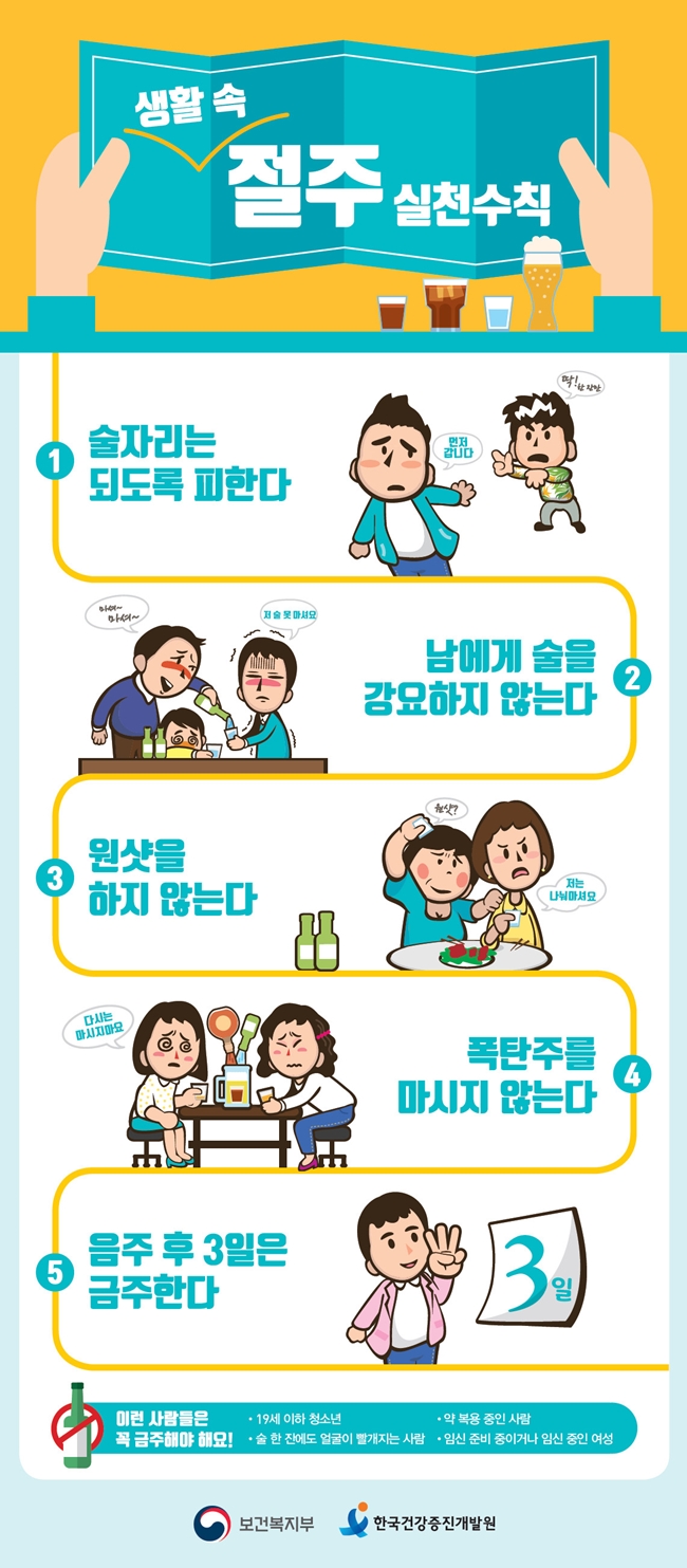 보건복지부와 한국건강증진개발원은 건전한 음주문화 정착을 위해 ‘생활 속 절주 실천수칙’을 마련했는데요. 생활 속 절주 실천수칙 5개를 인포그래픽으로 확인하세요!