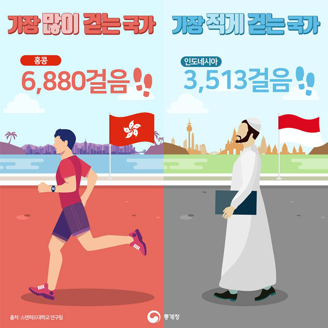 우리나라는 1일 평균 5,755걸음으로 세계 8위! 여러분은 하루에 얼마나 걸으세요?