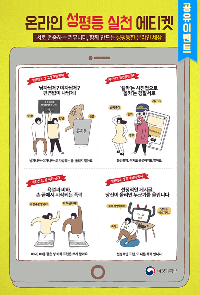 일상생활 속에서 성평등을 실천하기 위한 온라인 에티켓으로 △성 고정관념 타파, △불법 촬영 금지, △성 비하 금지, △성적 대상화 금지 등을 제시하고 있습니다.