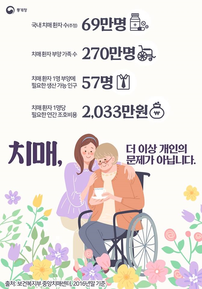 국내 치매 환자 수(추정)는 69만 명, 치매 환자 부양가족 수는 270만 명입니다. 또한, 치매 환자 1명 부양에 필요한 생산 가능 인구는 57명이며, 치매 환자 1명당 필요한 연간 조호비용은 2,033만 원입니다. 치매, 더 이상 개인의 문제가 아닙니다. 치매로부터 자유로워지는 대한민국을 기대합니다!