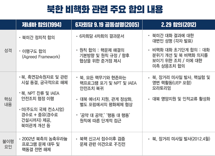 외교부가 20일 배포한 ‘북한 비핵화 관련 주요 합의 참고자료’에 따르면 ▲1994년 제네바 합의 ▲2005년 6자회담 9·19 공동성명 ▲2012년 2·29 합의 등의 주요내용은 다음과 같다.