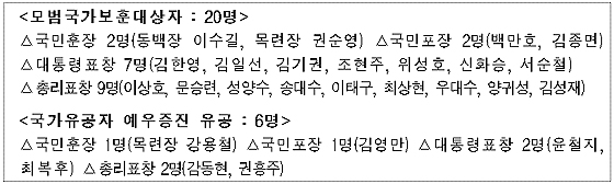정부포상식에서는 삶의 역경을 이겨내고 나라사랑에 이어 이웃사랑까지 실천해 보훈가족의 명예를 크게 드높인 모범 국가보훈대상자 20명과 국가유공자 예우증진을 통해 국가사회발전에 기여한 국가유공자 예우증진 유공자 6명이 정부포상을 수여 받는다.