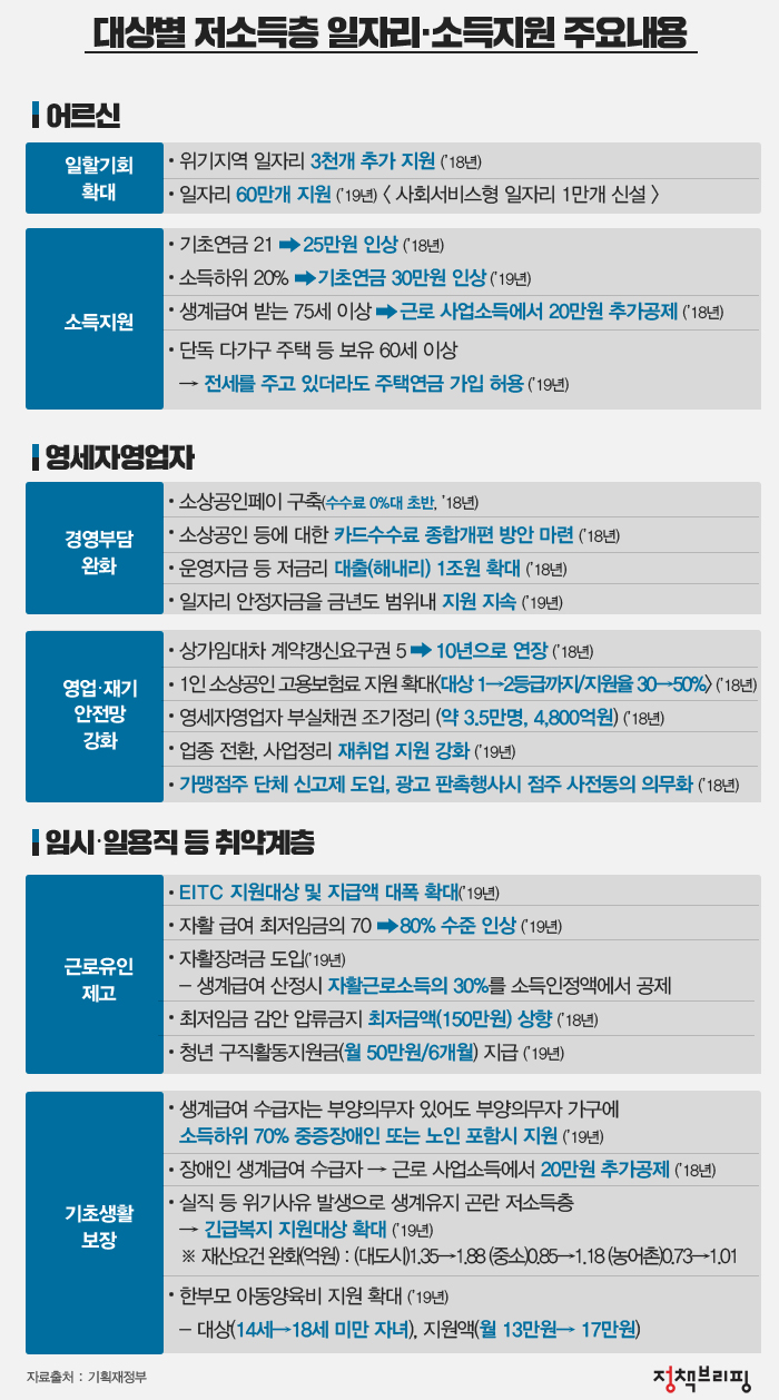 정부는 18일 ‘저소득층 일자리ㆍ소득 지원대책’을 발표했다. 대상별 저소득층 일자리·소득지원 주요 내용은 다음과 같다.