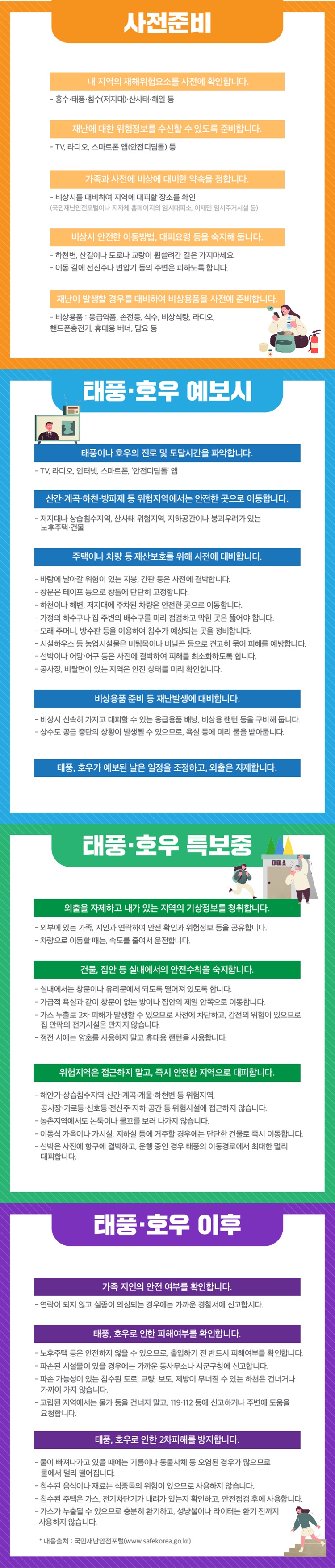 강한 중형급 태풍인 ‘솔릭’은 22일 자정에서 23일 새벽 사이에 제주도를 시작으로 전국에 영향을 줄 것으로 예상됩니다. 큰 피해가 없도록 사전준비부터 예보-특보-해제 이후까지의 상황별 국민행동요령을 숙지해주세요.