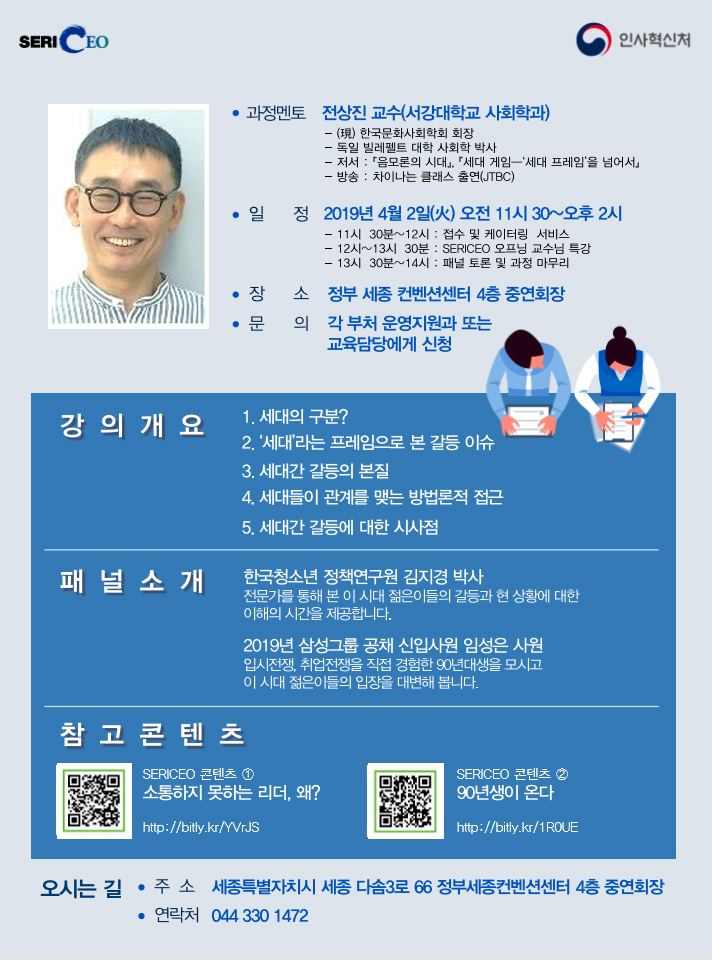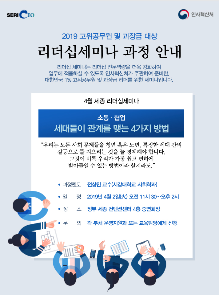 ‘세대들이 관계를 맺는 4가지 방법’을 주제로 리더십 세미나를 개최합니다. 리더십 전문역량을 더욱 강화하여 업무에 적용하실 수 있도록 인사혁신처가 주관하여 준비한, 대한민국 1% 고위공무원 및 과장급 리더를 위한 세미나입니다. 많은 신청 바랍니다.