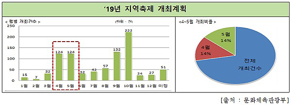 문화체육관광부가 공개한 자료에 따르면, 올해 지역축제는 날씨가 포근해지는 4월 124건으로 크게 증가해 5월까지 총 248건(전체의 28%)이 개최될 예정이다.