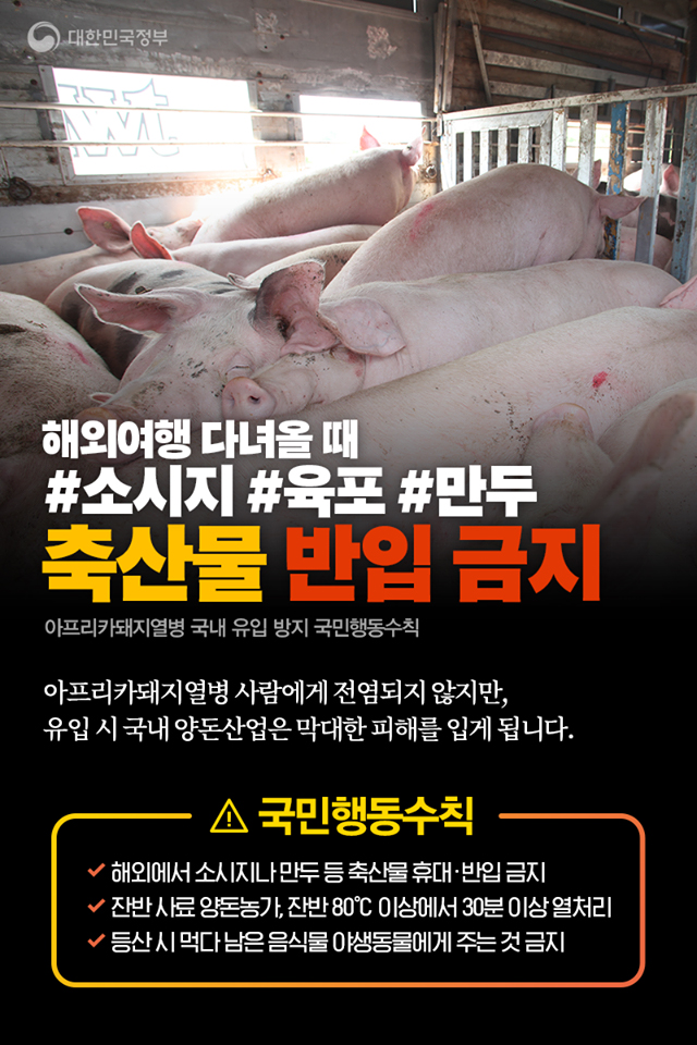 해외여행을 하실 때 중국·베트남 등 돼지열병 발생국 여행을 자제해주시고, 여행국가에서 축산물을 휴대하여 국내에 반입하는 일이 없도록 하여주시기 바랍니다. 국민 여러분과 축산농가에서도 행동수칙을 지키며, 아프리카돼지열병의 예방을 위해 적극 협조해주시길 당부드립니다.